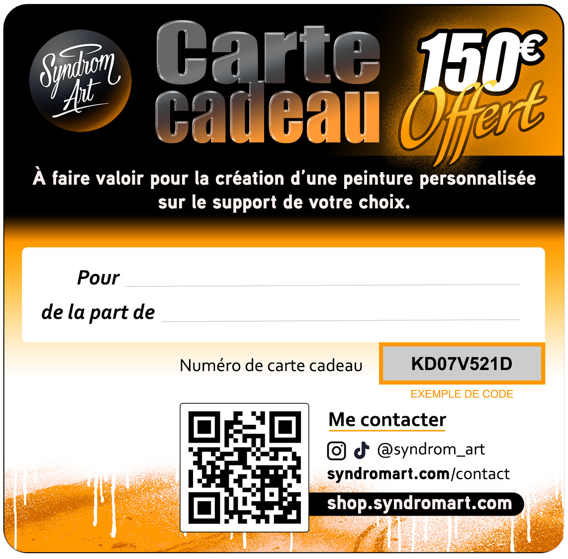 Carte cadeau pour une peinture personnalisée d’une valeur de 150€.